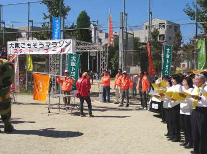 上段:コーラスの歌声に送られ入舟公園を出発。八幡屋小のT先生もコーラスに参加しています。