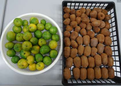 八幡屋小学校の果樹園でとれた「みかん」と「キウイフルーツ」です。少し置いておいて熟成させておくほうがおいしいかもしれません。