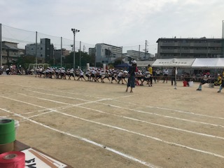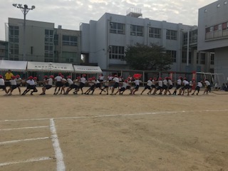 4年生がスタートラインから4分の1周走りつなをも持ちひきました。