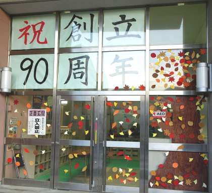 上段:玄関掲示。秋の紅葉と、手書きの「祝創立90周年八幡屋小」。