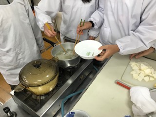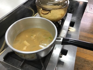 米は汁の具は学校で育てただいこんとあげと白ネギを使いました。