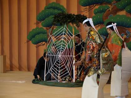 中段:土蜘蛛は、蜘蛛の糸を出して源頼光の家来の侍と戦います。