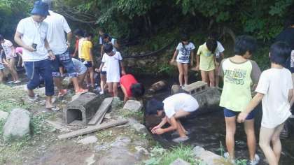 川に放された、アマゴやヤマメを追い詰めます。捕まえた後は、焼いておいしくいただきます。