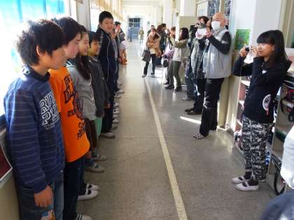 世界の名所の写真の前で、グループの並び方を変えて写真を撮り、組み合わせがいくつあるか考えました。