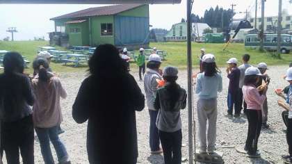暑さとしんどさと闘いながら全員登り切った「山登り」。ご褒美は、冷えたスイカ、オイシィ〜です。