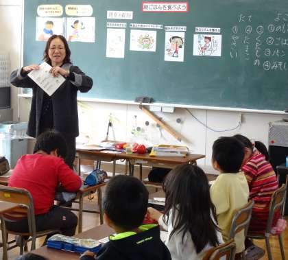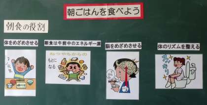 3年の栄養教育では、朝ごはんの大切さについて学習しました。朝ごはんは、脳と体をめざめさせ、体のリズムを整えるために、必要なものだと教えていただきました。
