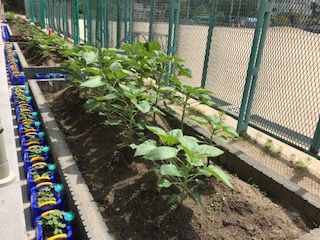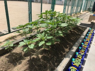 1年生の教室前の花壇に「ヒマワリ」を植えています。