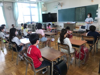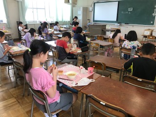 写真右・・・午後登校の子ども達が給食を準備する前の様子です。