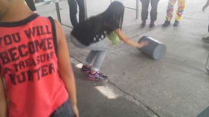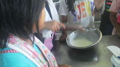 アイスクリームの材料、牛乳、砂糖、卵黄などを混ぜ合わせ、外側に氷の入った魔法瓶のような筒の内側に入れます。後は、「おいしくなぁ〜れ」と20分転がすだけで出来上がります。
