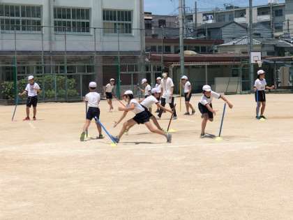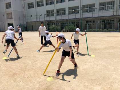 次の場所に移動し、棒を倒さないように受け渡すゲームです。