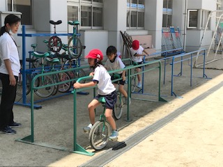 先生に、一輪車の練習を見てもらっている子どもの姿を見ました。