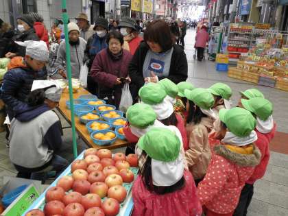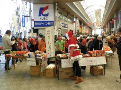 上段:八幡屋商店街の売り出しセール中で、サンタのお姉さんがキッズマートのアナウンスをしてくれました。
