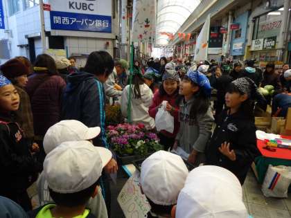 中段:港保育所の子どもたちが散歩の途中で寄ってくれました。先生に買っていただきました。