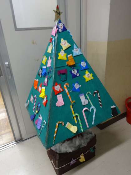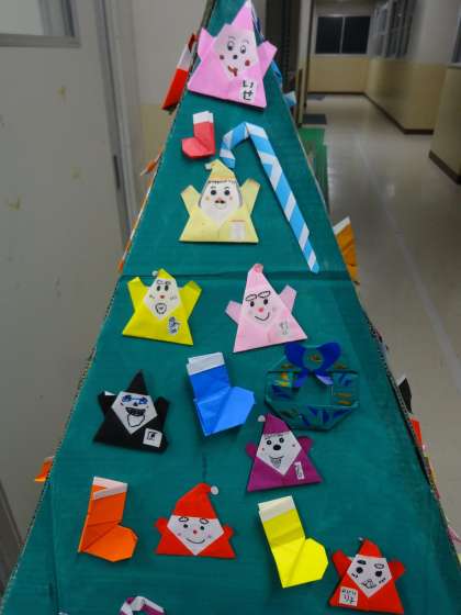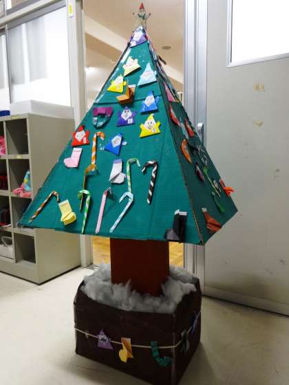 少し早いですが、みんなが作ったサンタをはりつけてクリスマスツリーができました。