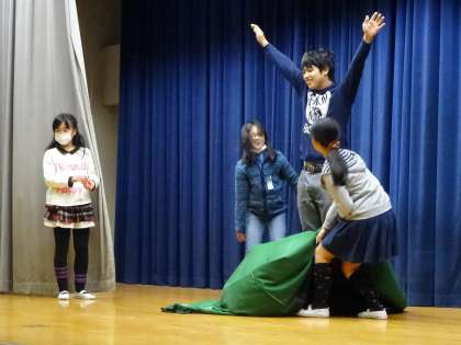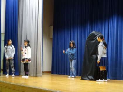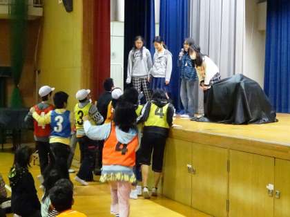 集会委員会の児童が先生当てクイズをしました。黒布に隠れて、手足や声でヒントを出して、どの先生が隠れているか考えました。