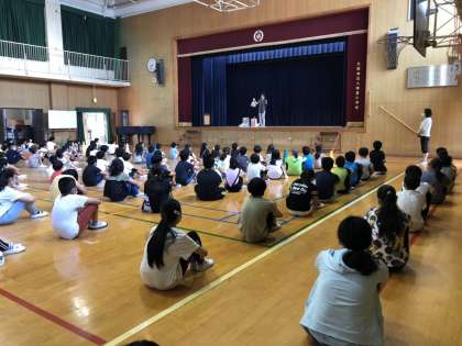 全校児童、全教職員で、5年生の子ども達に拍手を贈りました。