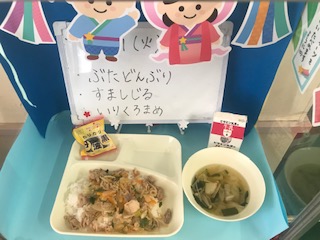 きゅうしょくには10しゅるいほどのまめが とうじょうします。