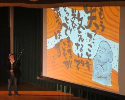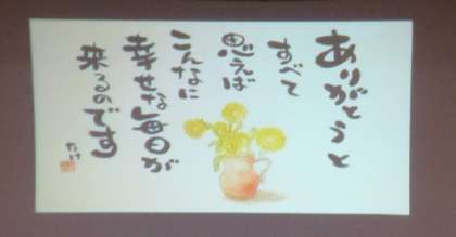 上・中段:たけさんの絵と詩の映像。講演は、映像を中心に、代読をまじえて行われました。