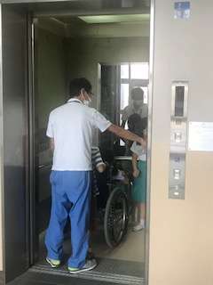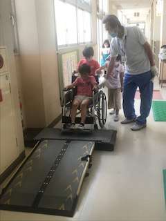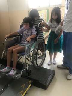 全員が、車いすに乗る人、車いすを押す人の体験をしました。