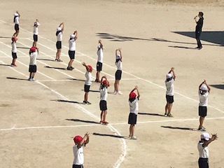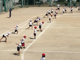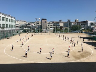 1年生と2年生が一緒に運動場で練習します。