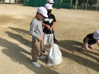 「石拾い集会」で集めたものを、土のうに入れました。