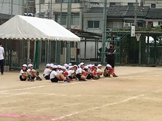 日曜日に実施予定の「スポーツ記録会」で発表する団体演技を 互いに見る「相互参観」を6時間目に実施しました。
