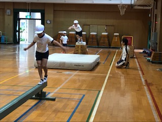 跳び箱に乗って、大きなマットの上をジャンプ・・・