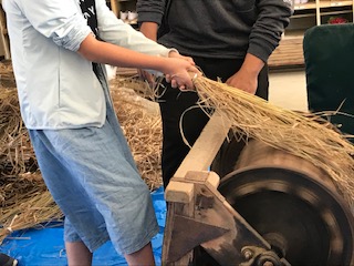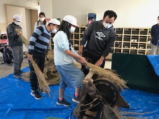 昔の脱穀機を使って、脱穀作業を体験しました。