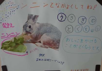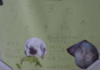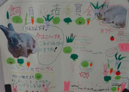 写真:飼育栽培委員会の「ウサギ」(ニンニンとロック)に関するクイズ入りポスターです。