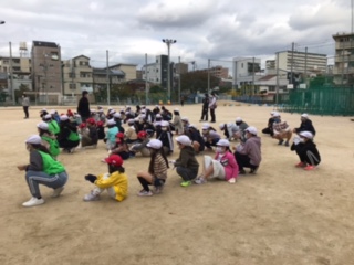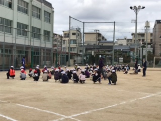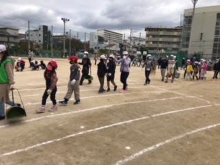 写真は、清掃の初めに、運動場に全員集合したところ、