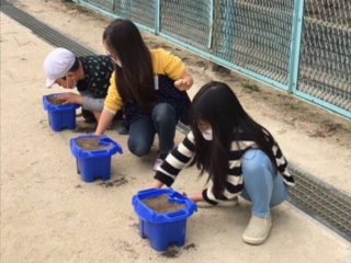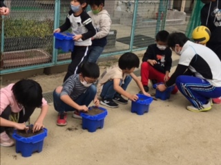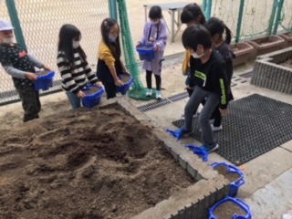 2年生の学習園の周りに少しずつ間をあけて並べました。