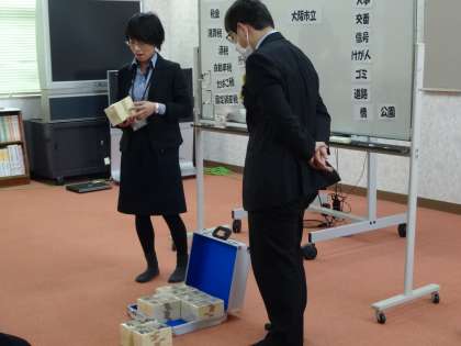 6年生は、税の教室。豊能府税事務所と港税務署の方に税金について教えていただきました。1億円の模造紙幣も持ってきていただき、1億円入りのトランクの重さを体験することができました。