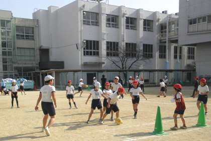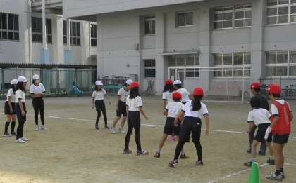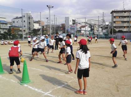 5時間目運動場で、3コートに分かれて、3年と5年でサッカーの試合をしました。