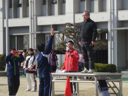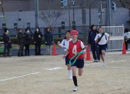2月10日(火)港中学校を会場に、港中学校1・2年生と池島小学校・八幡屋小学校6年生が集まり行われました。それぞれが中学校の外周道路とグランドを1周する9人でのリレーです。中学生はさすがにスライドも大きく速かったですが、小学生も負けずにがんばりました。駅伝終了後、PTAの方に昨日から準備していただいたあったかい豚汁をごちそうになりました。応援・声援ありがとうございました。