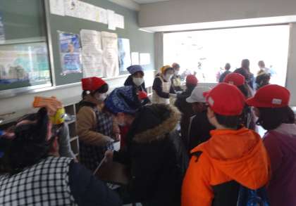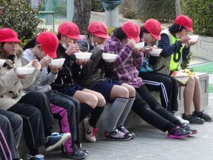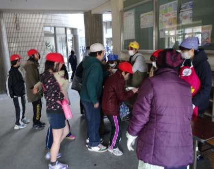 左・中段:は並んで、あったかい豚汁をPTAの方に入れていただきます。