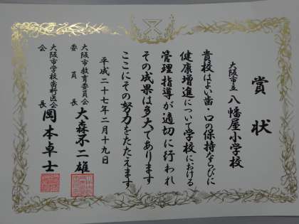 保健室の先生が代表として表彰状をいただいてきました。フッ素塗布や歯みがき指導、歯みがき月間などの歯の健康づくりの取組についての表彰です。