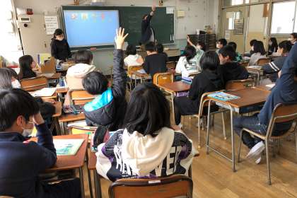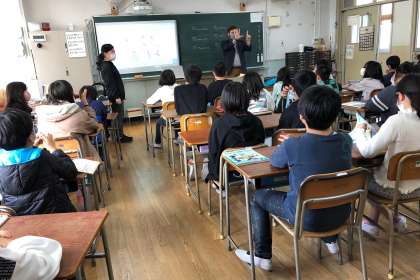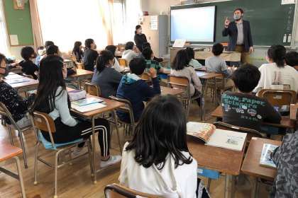 C-NETの先生が自己紹介した後、子どもたちからの質問に答えてくださいました。その後、ABCの学習をしました。