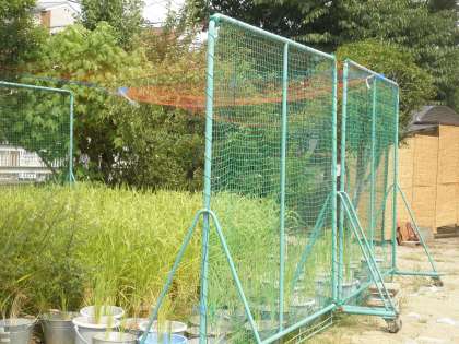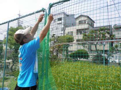 植えつけた稲も順調に育っています。雀の食害防止のため、8月8日の猛暑の中、先生方で雀除けのネットを張りました。食べるまであと2か月かな?
