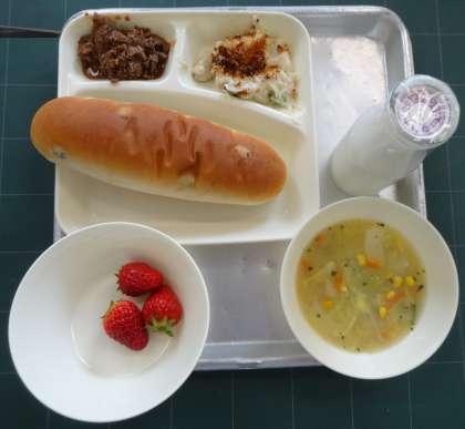 ビーフチャップ、ほたて貝のグラタン、コーンスープ、いちごです。