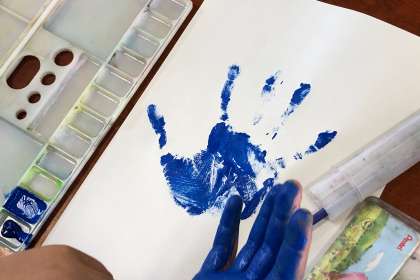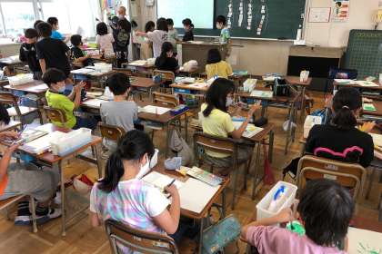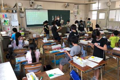 皆んなの力を合わせるために、手のひらを集め学級目標を考えました。