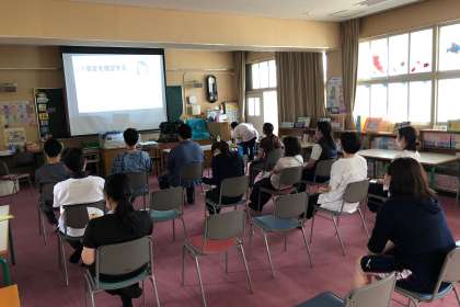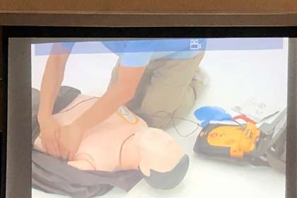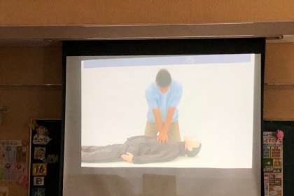 プール水泳を前に、心配蘇生法やAEDの使い方などの救命訓練を実施しました。