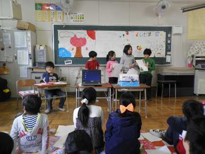 学年末まであと1日となった3月23日、3年生はお楽しみ会を行い、自分の特技や趣味を披露しました。保護者の皆様にも参加を呼びかけ、少し寒い中、ご参加いただきました。