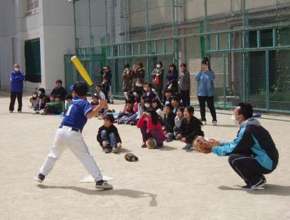 下:グランドでは野球少年が・・・・・校長先生も打席に立ち、みごと1塁線上