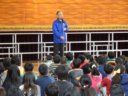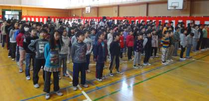 最初に5年代表の児童に修了証が渡された後、校長先生からは、自己実現のために、進級する次の学年に向けて何をするべきかしっかり考えてほしいとの話がありました。生活指導担当の先生からは、2つの注意がありました。1、「危険なことや危険につながることはやめてほしい。」川などの危険な場所に行く、自転車やスケボーなどで危険な乗り方をする、校区外に子どもだけで行くなどです。2、「地域の方に迷惑をかけない。」集まってうるさいぐらい大声でしゃべる、公園などにお菓子の包装紙を捨てる、自転車をじゃまなところにとめるなどです。 そして、最後にみんなで校歌を歌って修了式を終えました。