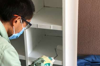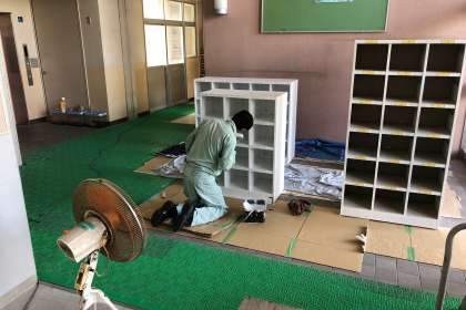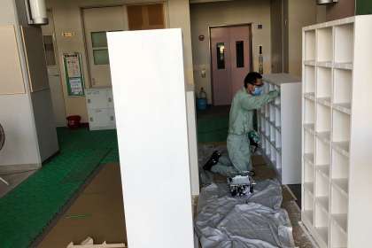 管理作業員さんが、色落ちし始めた下足箱をリニューアルしてくださっています。