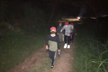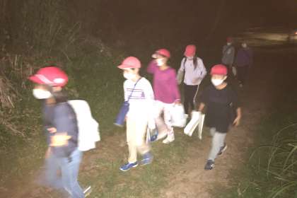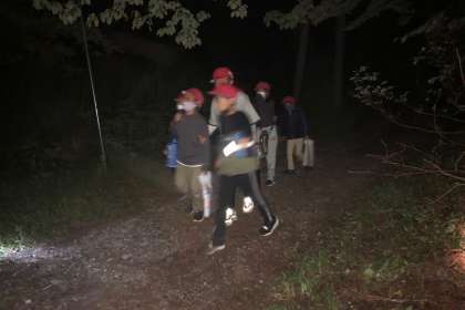 キャンプファイヤーの後、ナイトハイクを行いました。懐中電灯一つ持って林の中に入って行きました。あ〜怖いという声も…