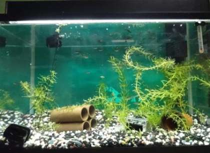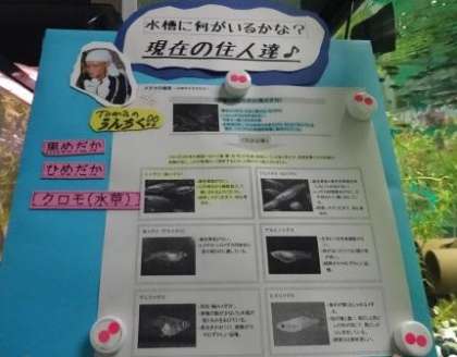 玄関におかれた水槽が増え、ライトもつき、うんちくおじさんの解説もついています。水槽のメダカは、校長先生と管理作業員さんが学校の池からすくって移しました。