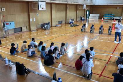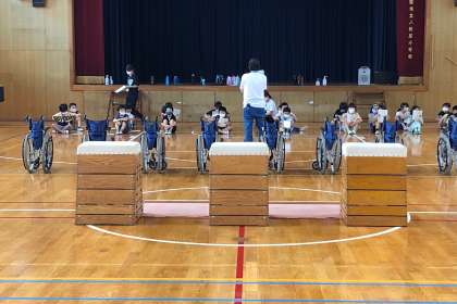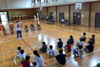 大阪市立心身障がい者リハビリテーションセンターのスタッフの皆さんが来てくださり、車椅子体験をしました。車椅子に乗るのも押すのも初めての子どもたちが多く、段差など障がい物を通るのに一苦労のようでした。最後にスタッフの方から、思いやりと優しさを持った大人になってくださいとのことでした。