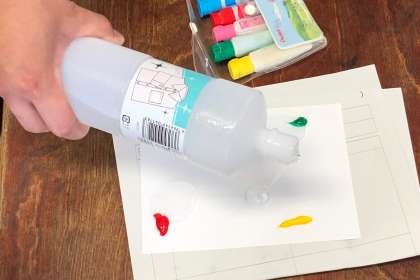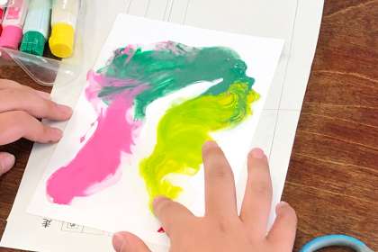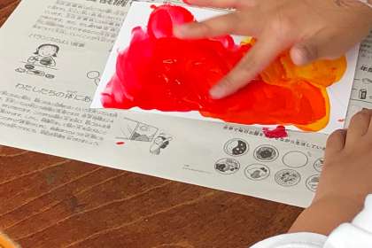 絵具と洗濯糊を薄めた液体を混ぜ合わせたグラデーションを描きました。これで8枚がそろい、一枚の画用紙なら貼り合わせました。
