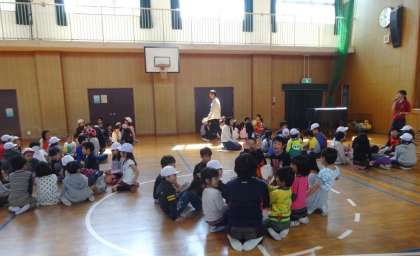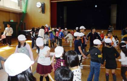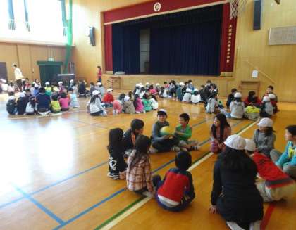 キッズチームは、1年生から6年生までのたてわり班で、毎週水曜日の児童集会にはこの班で集まります。また、水曜日の20分休憩にも班ごとのローテーションでいろいろな遊びを班でします。今日は集まって自己紹介をした後、全体でゲームをしました。その後の休み時間は第1回キッズタイムで、班ごとの遊び場所に分かれて一緒に遊びました。